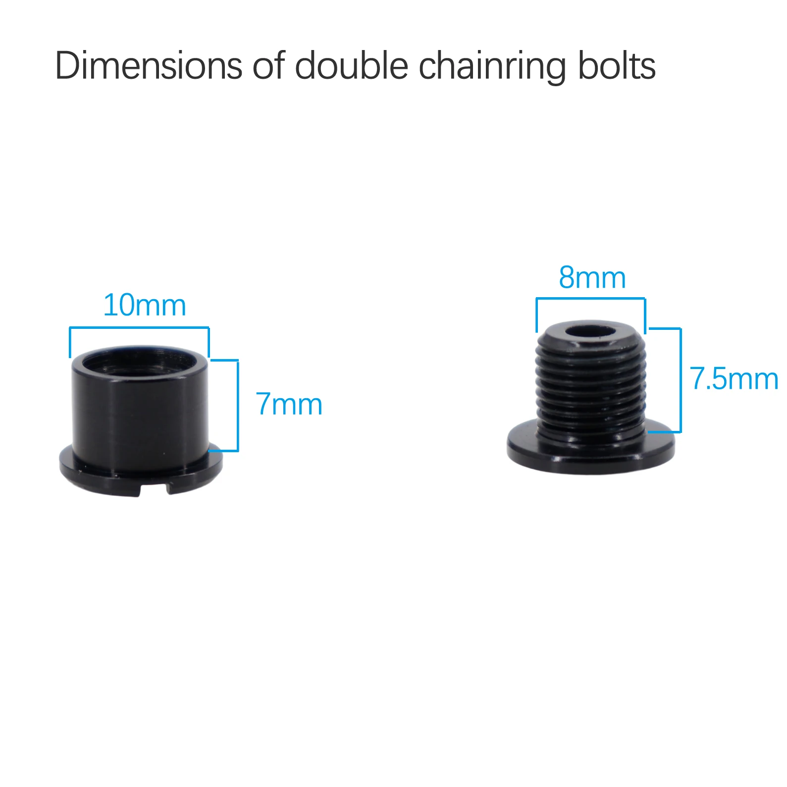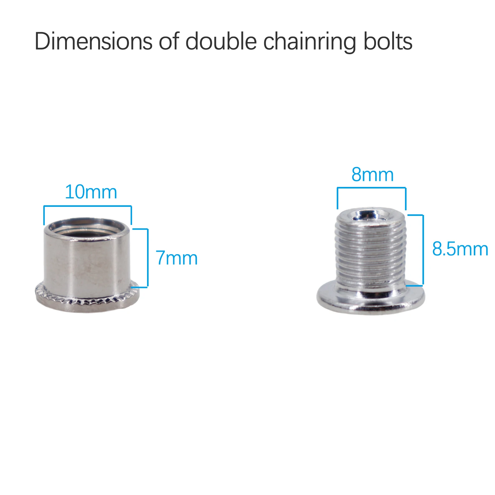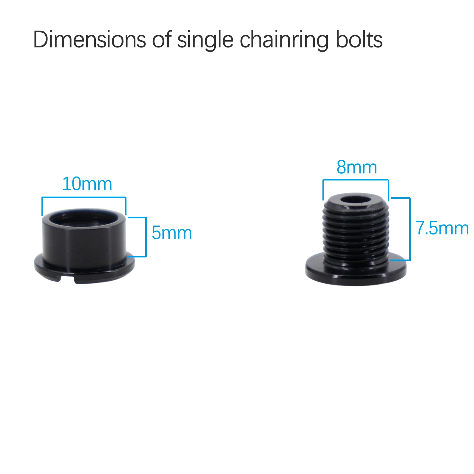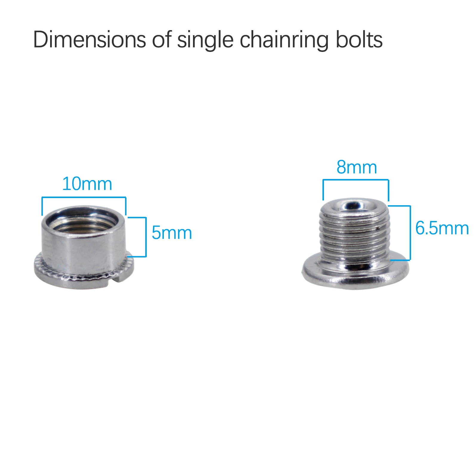 Size: Outer diameter of female bolts is 10mm. The thread diameter is 8mm. Fit for all kind of MTB and road bike chainrings.
