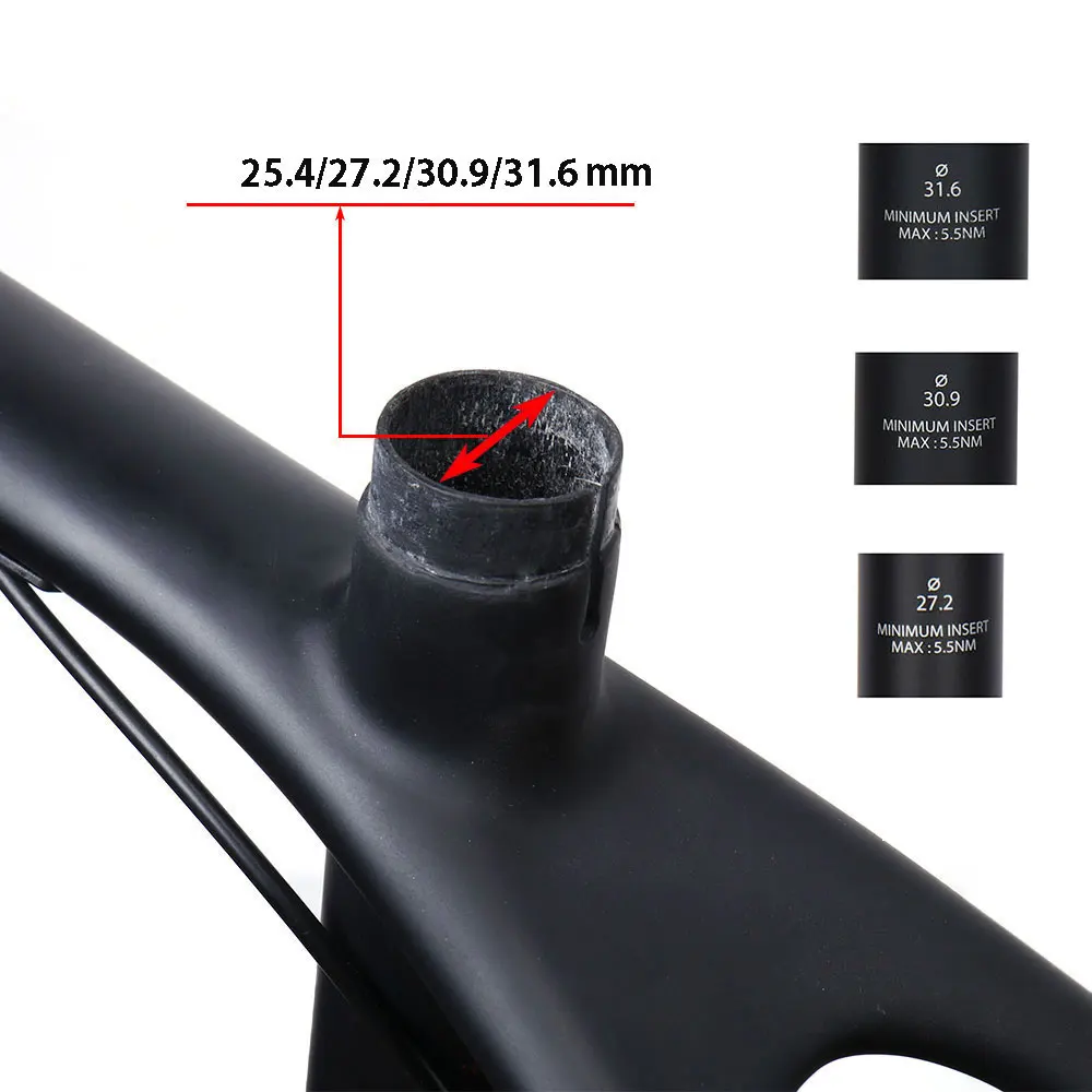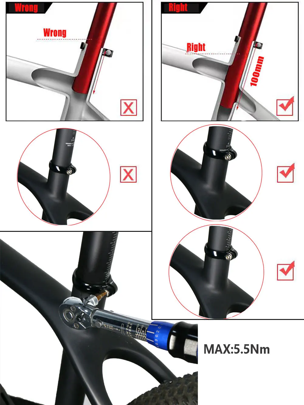 We recommend that you place the seatpost into the lower part of the frame 100mm and then tighten the seat tube clamp fixing bolts. Torque Spec:Seatpost Collar Determined by your Frame manufacture/Seatpost Collar(Recommended locking torque ≤ 5.5NM)