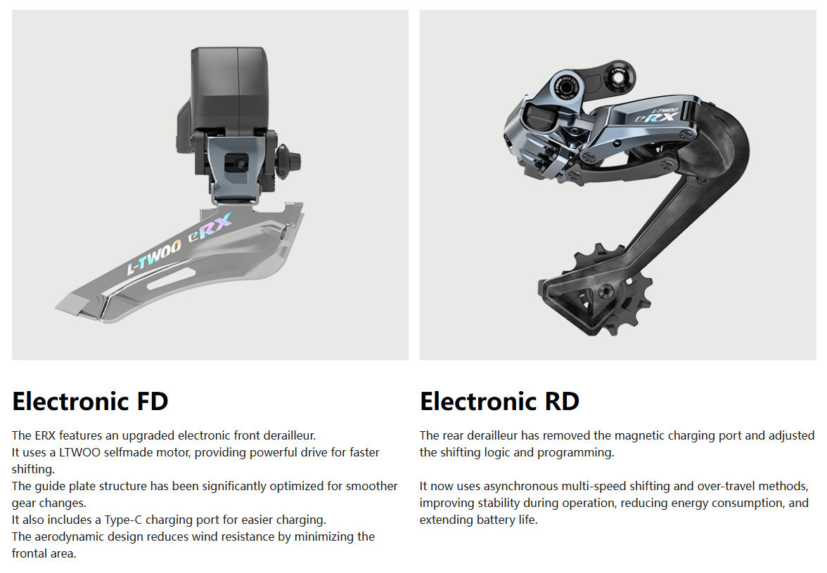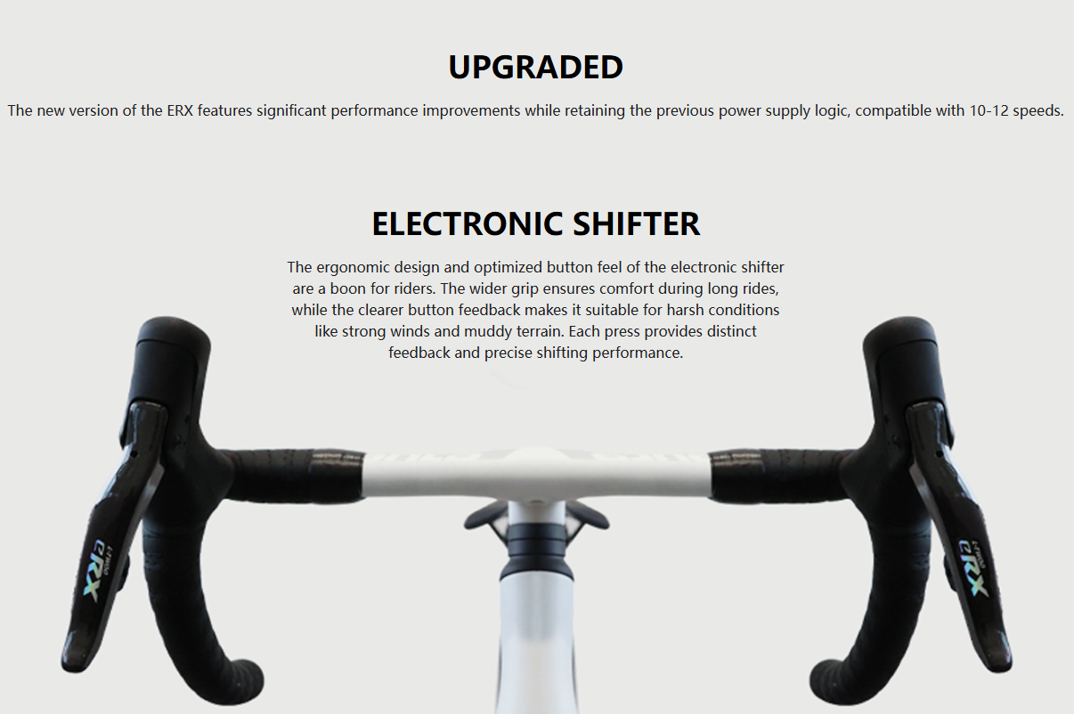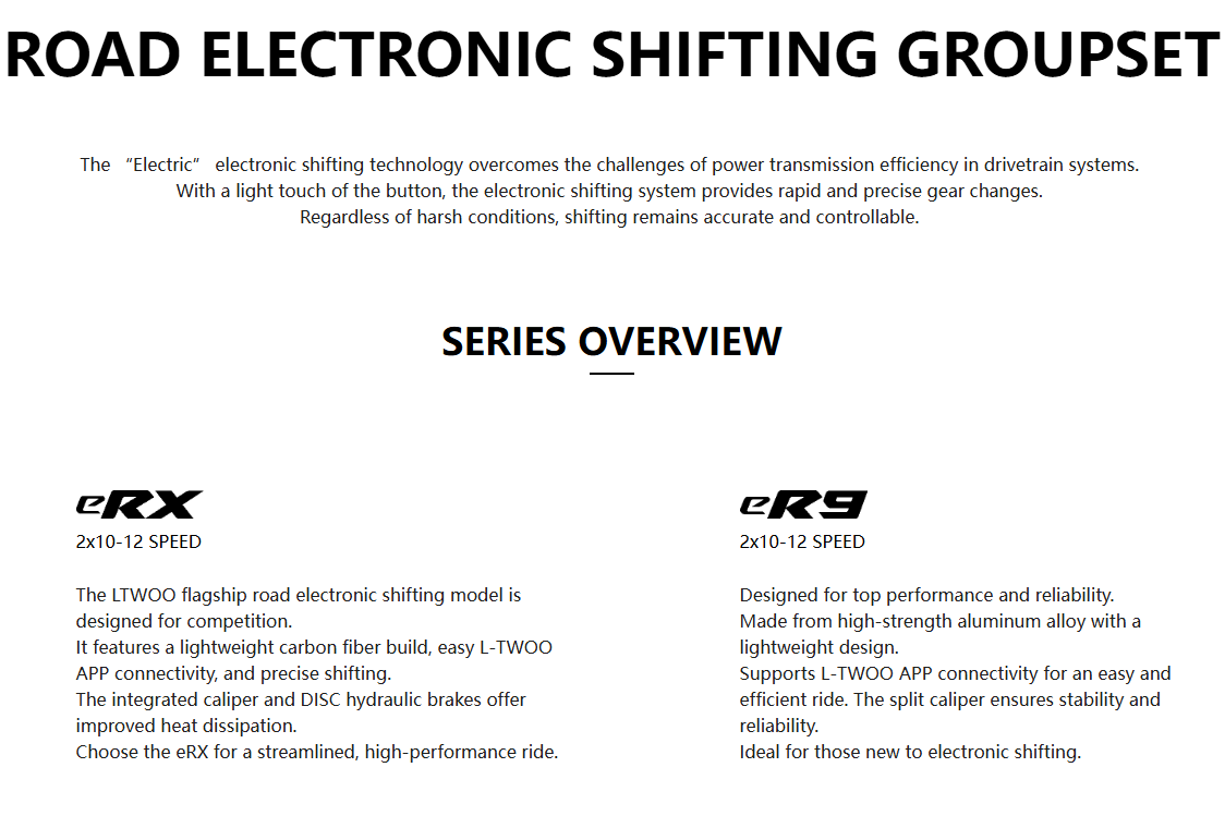 The LTWOO flagship road electronic shifting model is designed for competition. It features a lightweight carbon fiber build, easy L-TWOO APP connectivity, and precise shifting. The integrated caliper and DISC hydraulic brakes offer improved heat dissipation. Choose the eRX for a streamlined, high-performance ride.