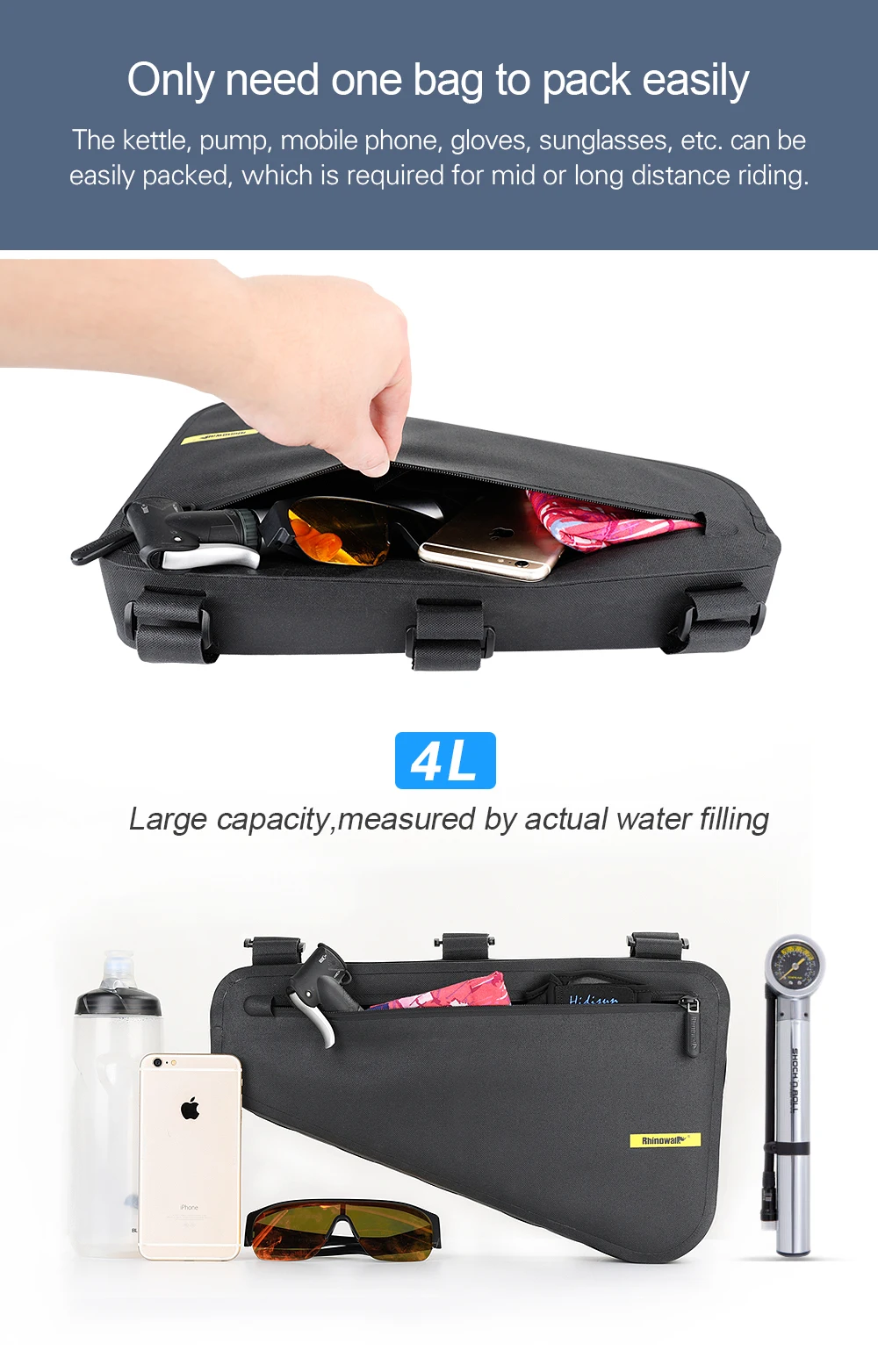Large capacity: making it ideal for medium to long distance riding.Simply pack a water bottle, pump, cell phone, gloves, sunglasses and more into one easy-to-use bag.