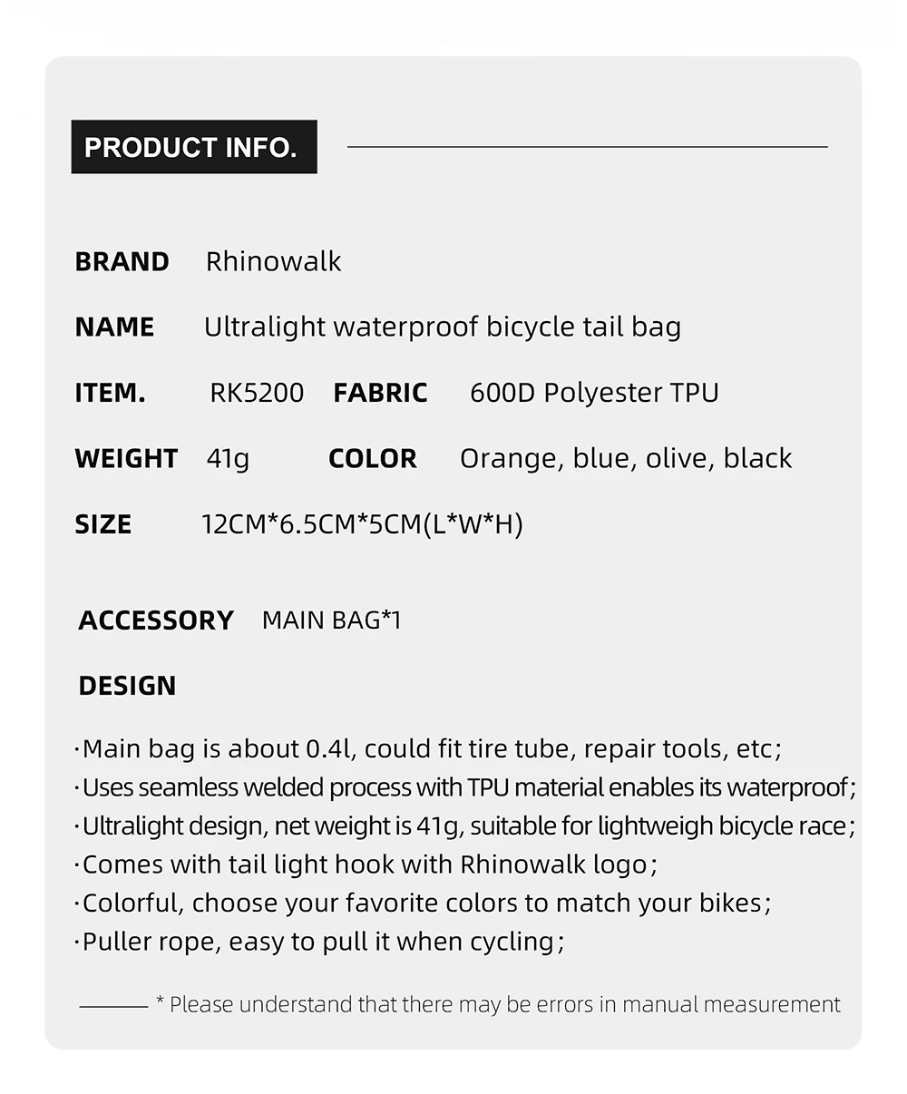 - Portable Design:At just 41g, the RK5200 Bike Tail Bag is ultra-light, making it easy to carry on any ride.