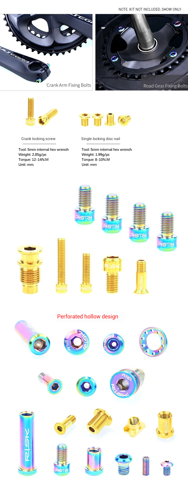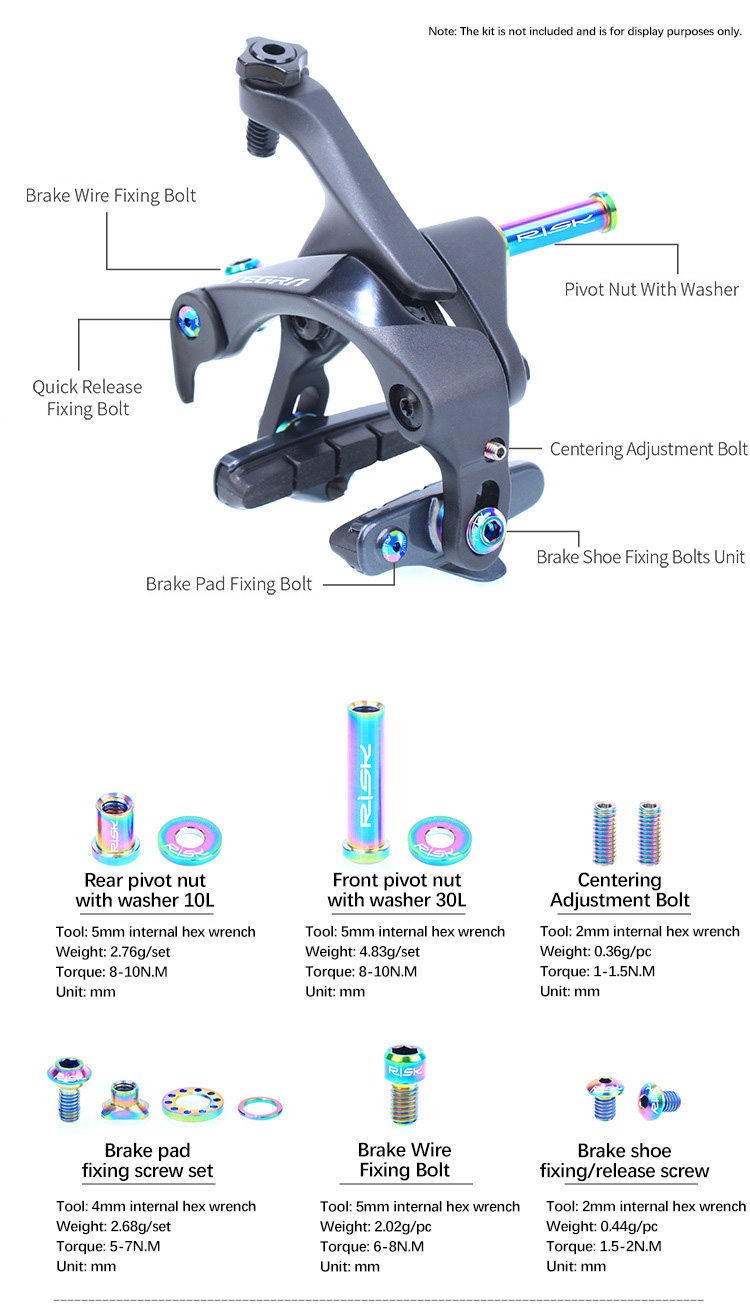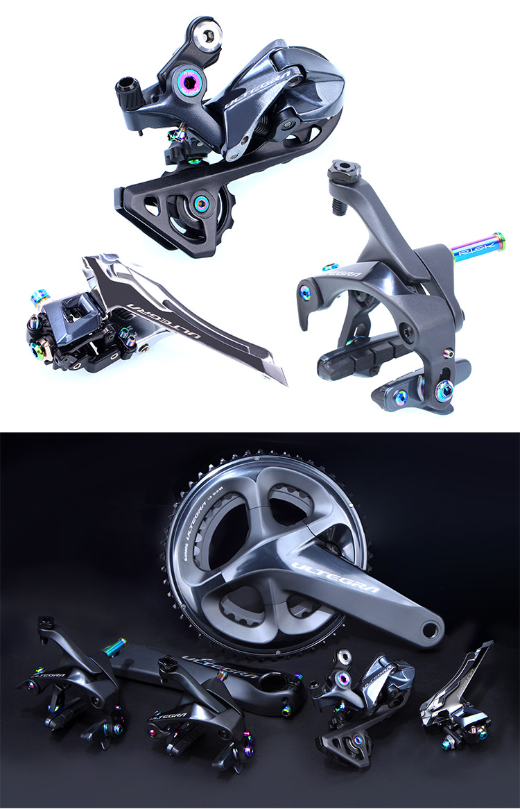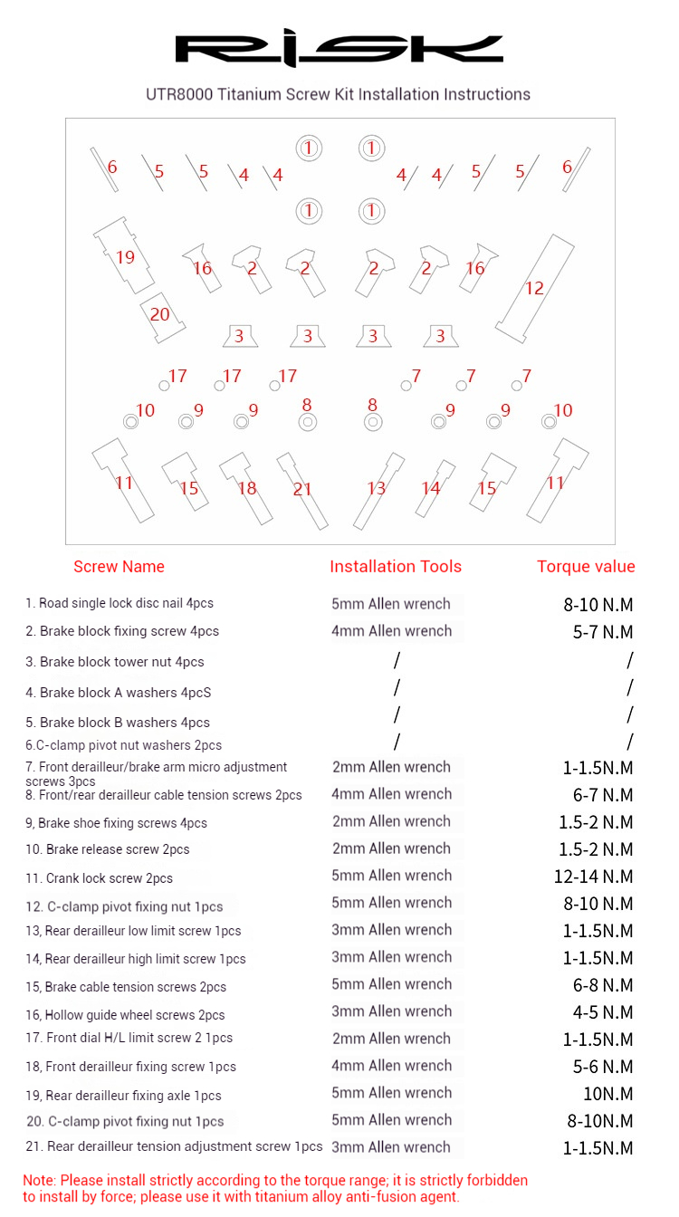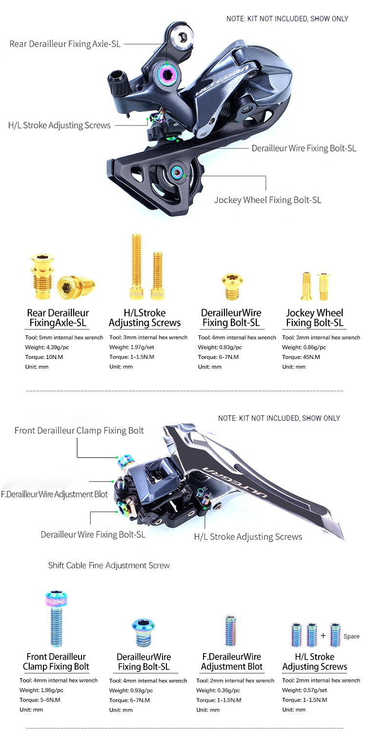 Instructions: This kit is designed for use with the UT-R8000 set. It features screws made from titanium, with a stylish and hollow design compared to the original steel screws. Before installation, carefully compare the specifications of the original screws and follow the recommended torque values. Do not force installation!